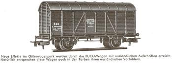 Der erste Schritt wird mit dem H0-Spezial Güterwagensortiment gemacht, indem auf die vielen in der Schweiz laufenden ausländischen Güterwagen Rücksicht genommen wird. Nicht nur in den Grenzbahnhöfen, sondern auch im Herzen der Schweiz begegnen wir täglich Güterwagen ausländischer Immatrikulation. Solche Originalbeschriftungen wurden an den grossen Vorbildern auf Bahnhöfen photographiert, verkleinert und auf die BUCO-H0 Güterwagen übertragen. Die Farben wurden vorbildsgetreu gewählt.