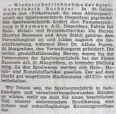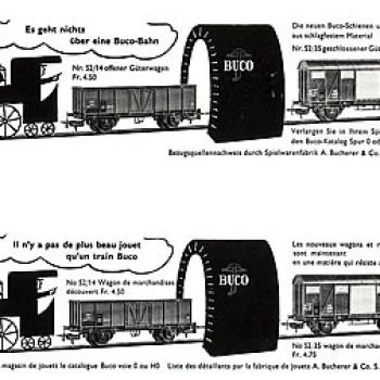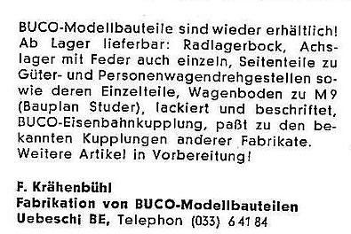 Sobald bekannt war, dass BUCO eine H0-Bahn herausbringen würde, wussten schon einige „besonders gut Informierte“, dass BUCO nun mit der Fabrikation der Spur 0 aufhöre. Leider konnte diese Meinung da und dort aufkommen, weil BUCO die für dieses Jahr vorgesehene Neuheit, eine Dampflokomotive, infolge Arbeitsüberlastung der H0, nicht herausbringen konnte. BUCO denkt natürlich nicht daran, die Spur 0 aufzugeben, im Gegenteil, es sind immer noch viele Neuheiten in dieser Spur geplant.