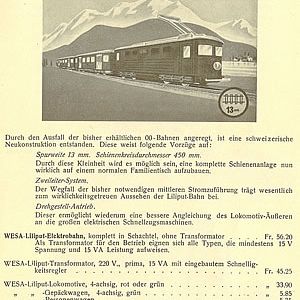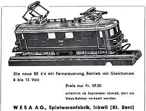 Die WESA-Bahn, ursprünglich als Spielzeug gedacht, hat sich mit der im Juni an der Basler Mustermesse vorgestellten Modell-Lokomotive Re 4/4, welche ausserordentlich gut gelungen ist, bestimmt auch Freunde in unserem Lager geholt. Mit dieser Maschine ist nun auch WESA zum Gleichstrom übergegangen.