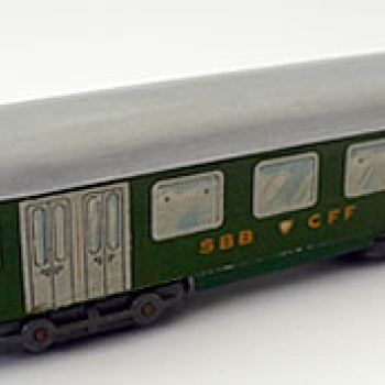 Nr. 140 Loko grün mit Pantograph, 12 Schienen und die robusten Vierachser-Personenwagen (Nr. 220) aus Holz. Fr. 54.-