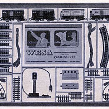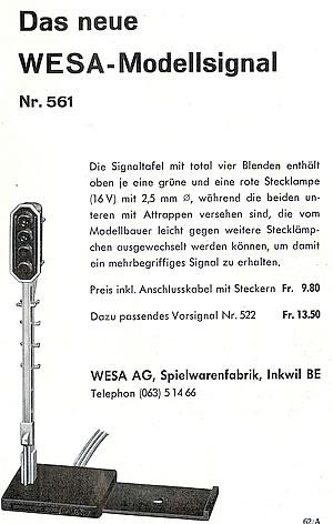 WESA –Lichttagessignale sind die Neuheit des Jahres, besonders deshalb weil sie nicht nur den WESA-Bahnbesitzern, sondern auch allen H0-Modelleisenbahnern dienen. Signale mussten bis heute durchwegs stark überdimensioniert werden, bedingt durch die Glühlämpchen von 5 mm Durchmesser. Als dann Steckbirnen mit nur 2.5 mm Durchmesser auf dem Markt erschienen, kamen die bekannt rührigen Geister von WESA auf den Gedanken, ein noch kleineres Signal, und zwar nach SBB-Vorbild, zu schaffen. Die Signale, ein Bijou ihrer Art, sind im Massstab 1:87 d.h. für Spur H0 praktisch massstäblich. Unter den Güterwagen finden wir eine neue Art Kesselwagen der Avia-Gesellschaft (Nr. 244). Dieses in den zündenden Farben weiss-rot gehaltene Wagen wird das Zugbild noch mehr beleben.